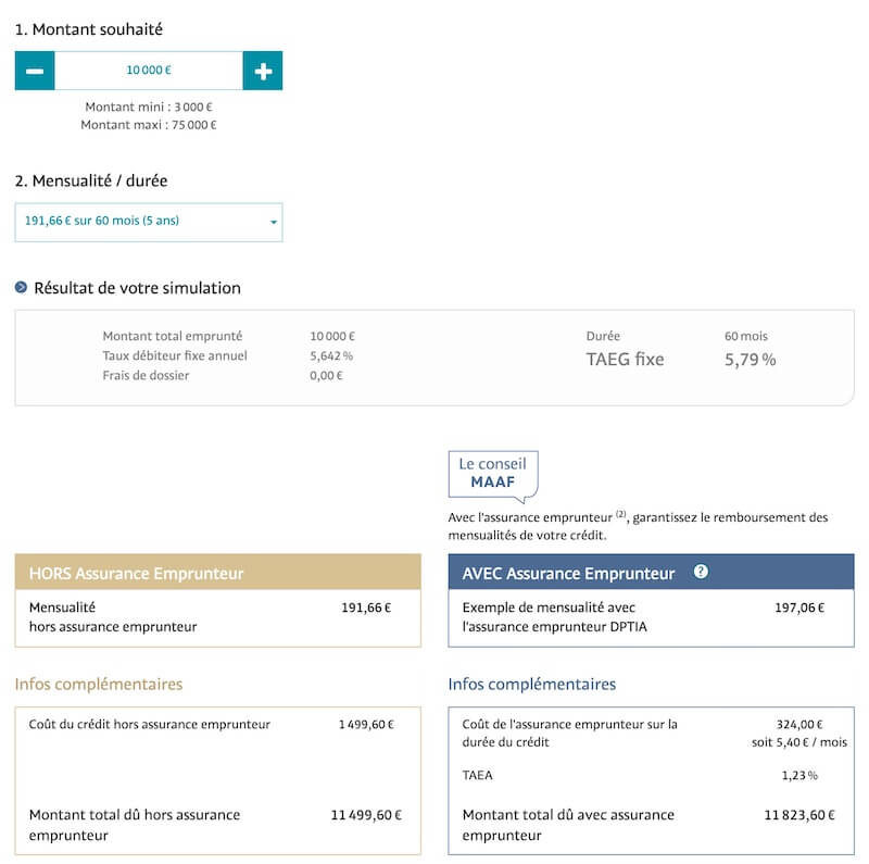 La calculatrice de crédit auto disponible sur le site de la MAAF est facile à utiliser et propose des calculs de crédit auto fondés sur la grille tarifaire de l'assureur.