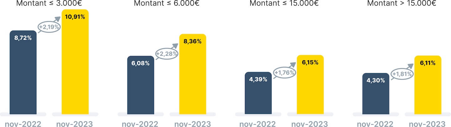 Selon les montants, les hausses de taux sur 1 an sont comprises entre +1,76% et +2,19%. A titre d’exemple, pour un prêt personnel d’un montant supérieur à 15.000€, le TAEG moyen était de 4,30% en novembre 2022 et se situe à 6,11% en moyenne en novembre 2023. Il a donc progressé de 181 points de base au cours des 12 derniers mois.