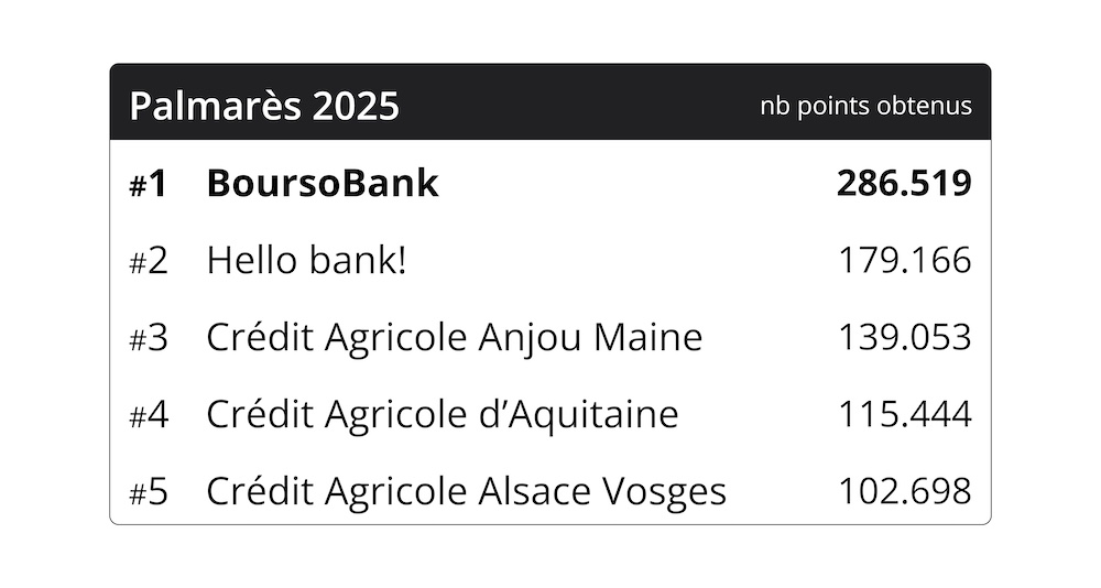 Chaque semaine, les banques les mieux positionnées se sont vu attribuer des points en fonction de leur rang : 5 points pour la première place, 4 pour la deuxième, puis 3, 2 et 1 point jusqu’à la cinquième position. Les établissements cumulant le plus de points sur l’année sont donc ceux qui ont le plus souvent proposé les taux les plus compétitifs, tous projets et durées confondus.
