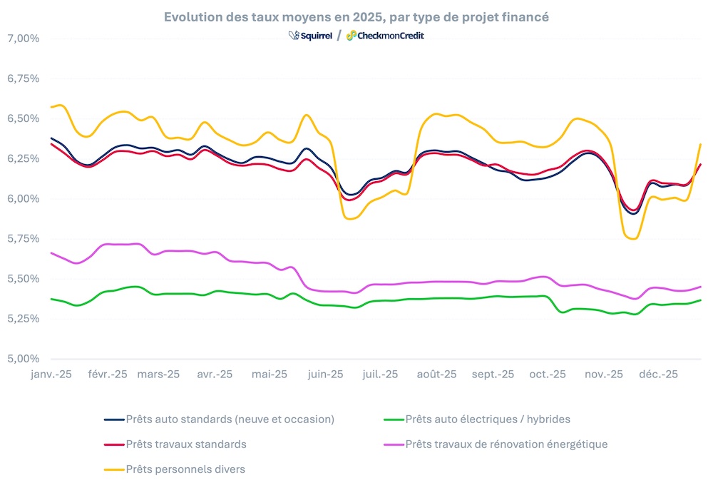 Dans un contexte de consommation ralentie, les banques et établissements de crédit ont cherché à soutenir la demande en ajustant progressivement leurs conditions tarifaires. Tout au long de l’année 2025, les taux des prêts personnels ont ainsi légèrement reculé, quel que soit le type de projet financé : achat de véhicule neuf ou d’occasion, travaux ou prêt personnel sans justificatif.